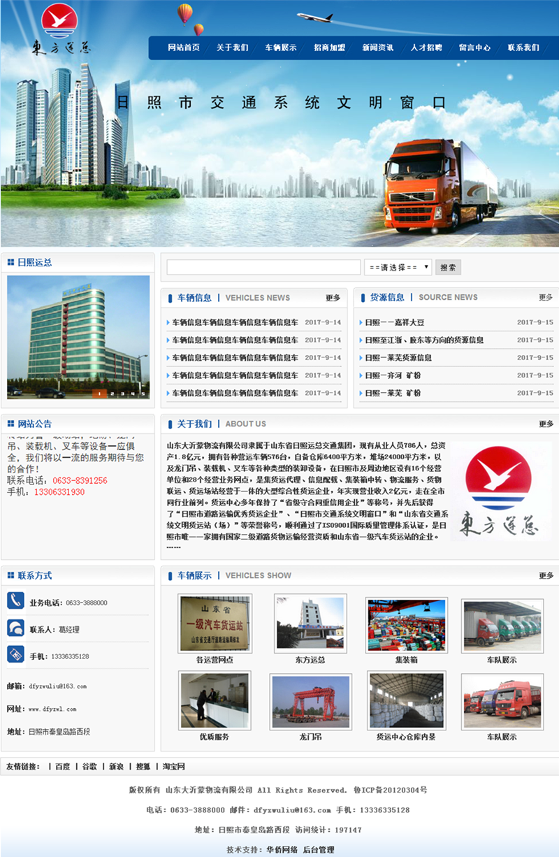 山東大沂蒙物流有限公司隸屬于山東省日照運(yùn)總交通集團(tuán),現(xiàn)有從業(yè)人員786人,總資產(chǎn)1.8億元,擁有各種營運(yùn)車輛576臺,自備倉庫6400平方米,堆場24000平方米,以及龍門吊、裝載機(jī)、叉車等各種類型的裝卸設(shè)備,在日照市及周邊地區(qū)設(shè)有16個經(jīng)營單位和28個經(jīng)營業(yè)務(wù)網(wǎng)點(diǎn),是集貨運(yùn)代理、信息配載、集裝箱中轉(zhuǎn)、物流服務(wù)、貨物聯(lián)運(yùn)、貨運(yùn)場站經(jīng)營于一體的大型綜合性貨運(yùn)企業(yè),年實(shí)現(xiàn)營業(yè)收入2億元,走在全市同行業(yè)前列。貨運(yùn)中心多年保持了“省級守合同重信用企業(yè)”等稱號,并先后獲得了“日照市道路運(yùn)輸優(yōu)秀貨運(yùn)企業(yè)”、“日照市交通系統(tǒng)文明窗口”和“山東省交通系統(tǒng)文明貨運(yùn)站(場)”等榮譽(yù)稱號,順利通過了ISO9001國際質(zhì)量管理體系認(rèn)證,是日照市唯一一家擁有國家二級道路貨物運(yùn)輸經(jīng)營資質(zhì)和山東省一級汽車貨運(yùn)站的企業(yè)。